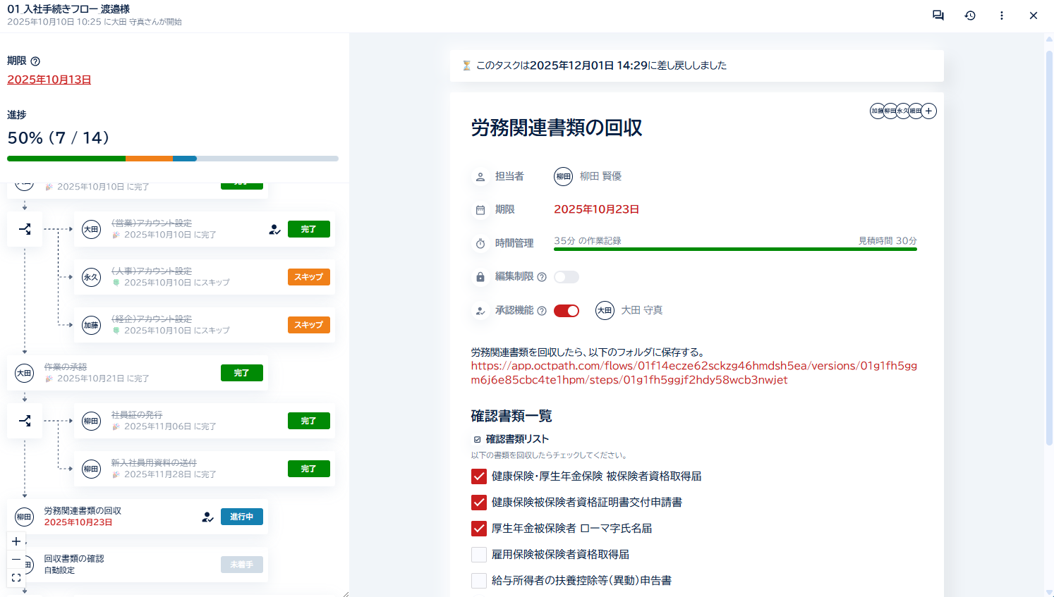 octpathのようなプロセスマネジメントツールを導入すると、業務の「入り口」から「出口」までがデジタル上のレールとして敷かれます。作業者はそのレールに沿って入力を進めるだけで、自然と「To Be」を体現した動きになります。これにより、教育コストを最小限に抑えながら、初日から理想のクオリティで業務を遂行することが可能になります。