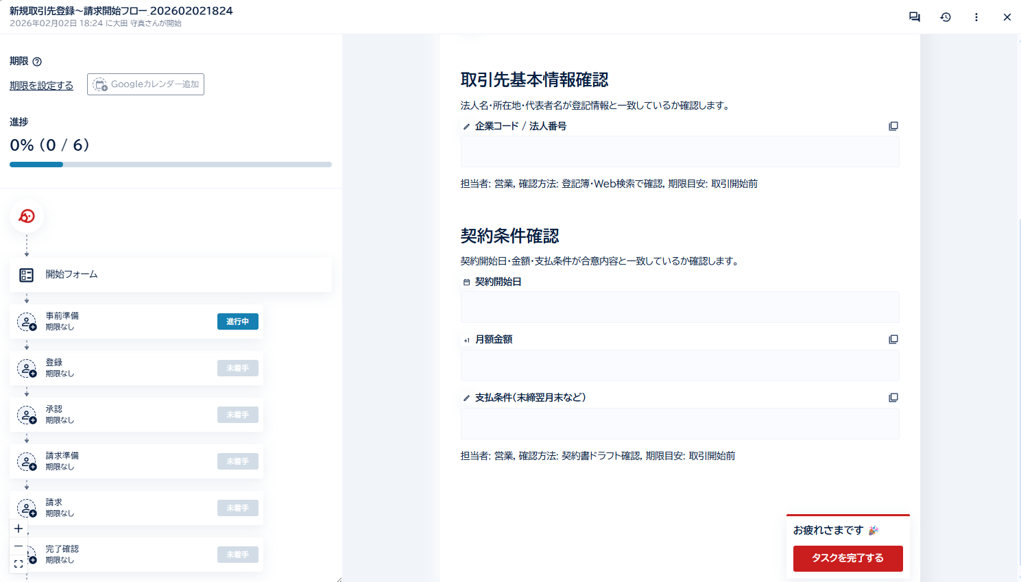 ■担当者・期限の紐付け: どの部門が担当し、いつまでに完了させるべきかの期限を自動設定したり、スケジュールが全体に反映される状態にします。