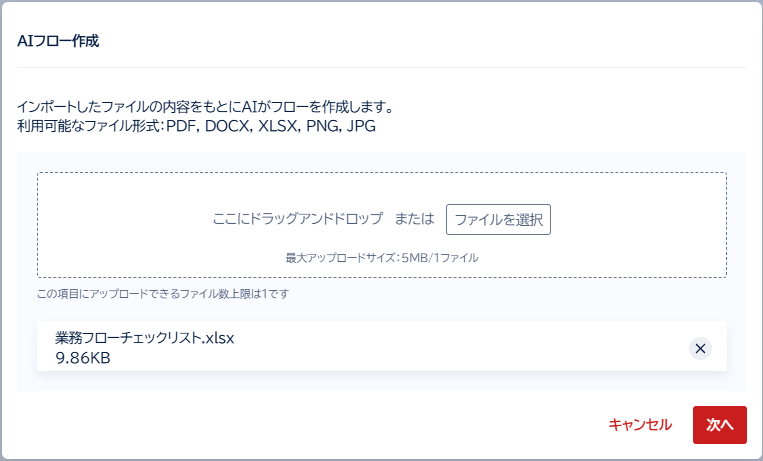 次に、用意したファイルをインポートします。 ファイルをoctoathにアップロードするだけで、AIがファイルを解析し、octpath上でのフロー構造を自動で生成します。