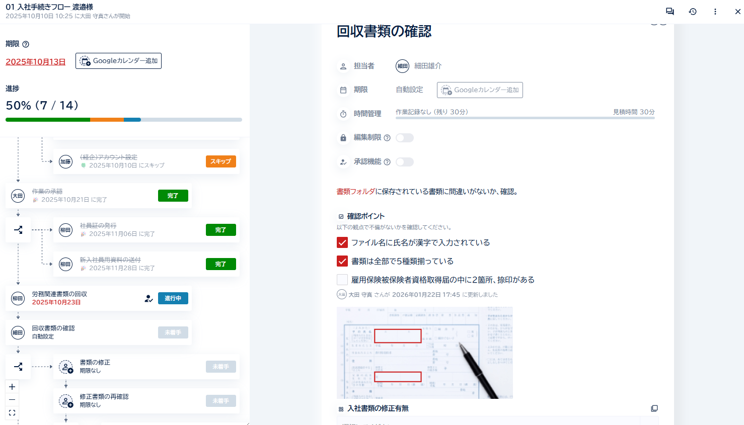 「確認したつもり」による漏れを防ぐため、octpathではチェックリストの完了をタスク終了の必須条件に設定することができます。重要なステップをスキップして次の工程に進むことが物理的にできない仕組みを構築することで、ダブルチェックの手間を減らしつつ、高い業務品質を維持します。