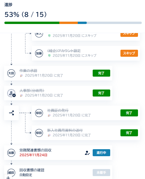 スイムレーン形式を用いることで、営業、事務、経理といった各部門の役割が水泳のレーンのように整理されます。 自分のレーンにタスクが回ってきた時だけ通知が届き、何をすべきかが示される。これにより、抜け漏れの防止や二重対応のミスを物理的に防ぐことが可能です。