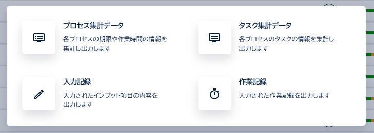 また、日々の業務で記録された内容や担当者ごとの作業時間、案件ごとの作業記録をcsvで出力し、データに基づいたボトルネックの特定ができるため、「なんとなく忙しい」という感覚的な議論から脱却し的確な人員配置や工程改善が可能になります。