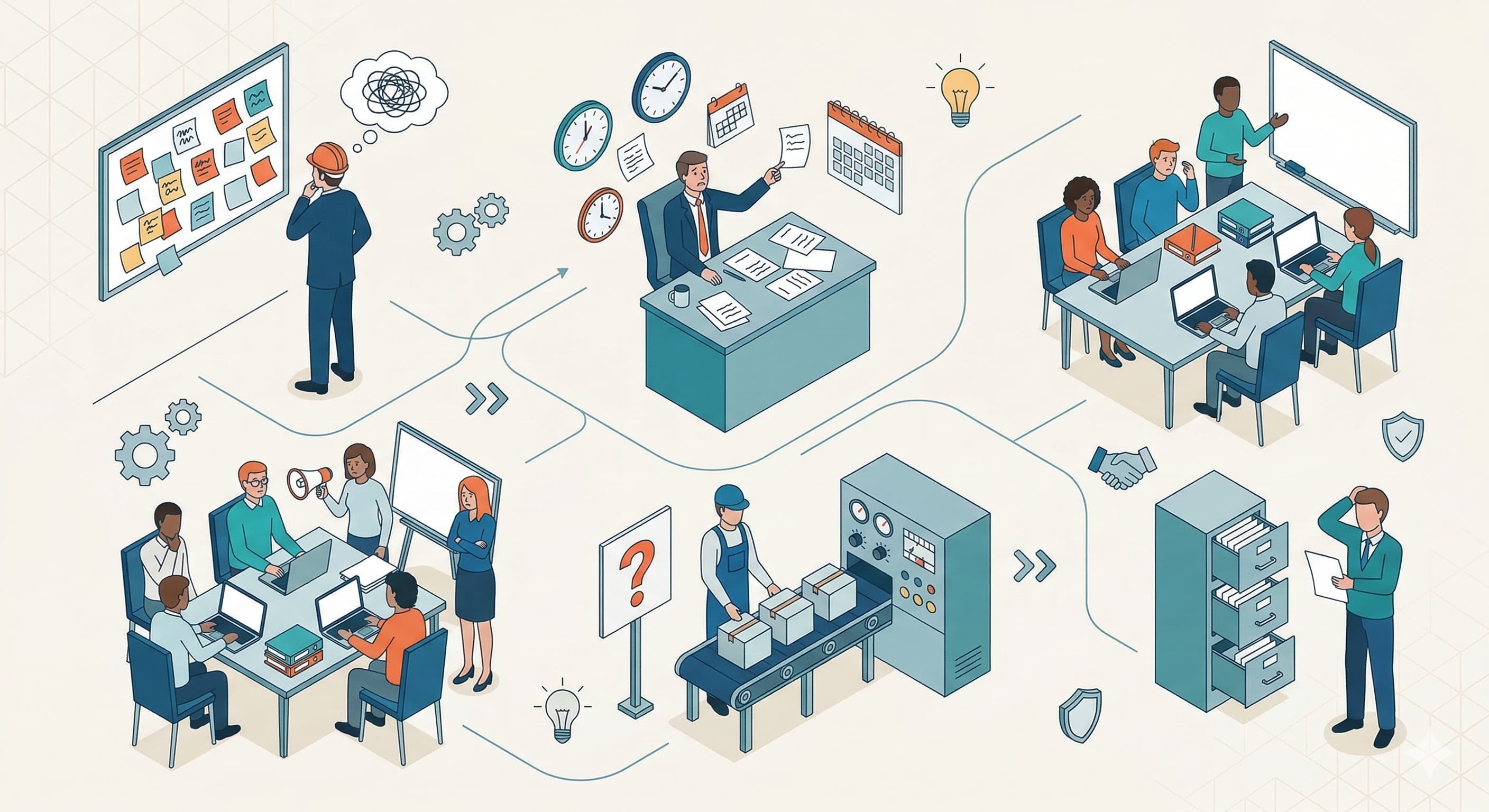実は、ベテラン社員の「なんとなく」の勘で回っている作業や、誰も読んでいないのに出し続けている報告書など、現場には多くの「目に見えない無駄」が潜んでいます。まずは、かっこいいフローを描くのをやめて、今の仕事が「実際にはどう動いているのか」を、ありのまま書き出してみてください。